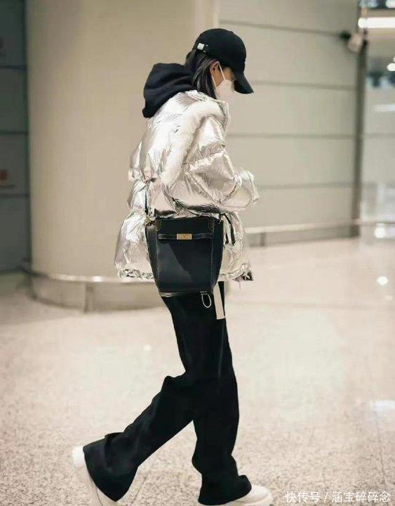 脚上的白色厚底鞋太懂「呼应」了,和银色羽绒服都是浅色系,上下一搭,整个造型的层次感就出来了,不像有些搭配东一个色西一个色,看着就乱。还有黑色棒球帽和黑包包,刚好压一压亮面的张扬,既保留了时髦度,又不让人觉得“太使劲”。