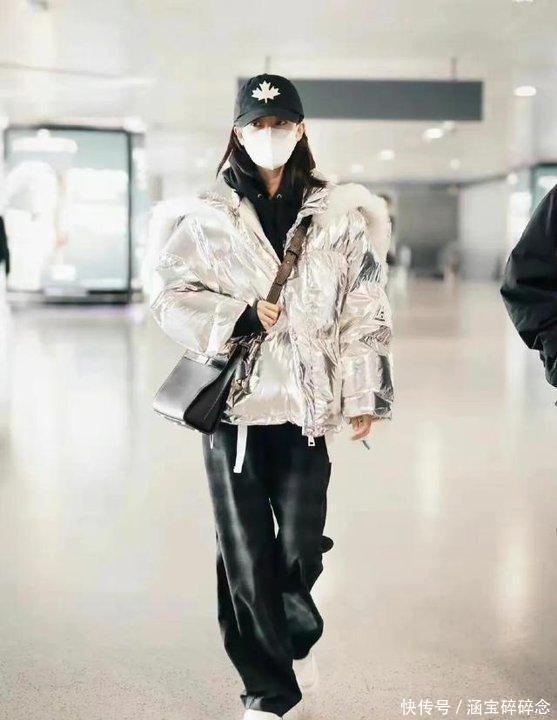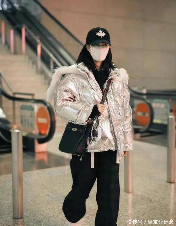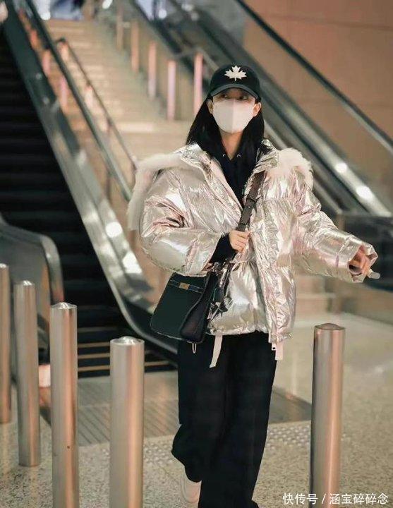 张小斐一身慵懒风造型,减龄又时尚,银色羽绒服搭阔腿裤个性十足
